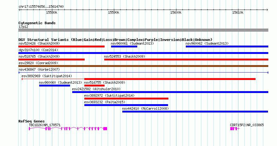 Variant DetailsVariant: nsv436847 | Internal ID | 15381330 | | Landmark | | | Location Information | | | Cytoband | 17p12 | | Allele length | | Assembly | Allele length | | hg38 | 40085 | | hg19 | 40085 | | hg18 | 40085 |