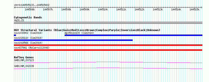 | | Variant Type | CNV loss | | Copy Number | | | Allele State | | | Allele Origin | | | Probe Count | | | Validation Flag | | | Merged Status | M | | Merged Variants | | | Supporting Variants | nssv468634, nssv468635 | | Samples | NA19201, NA19202 | | Known Genes | GAB1 | | Method | SNP array | | Analysis | Mendelian inconsistencies - for each genotype assay and population sample we defined the Mendel failure pattern of that assay as the binary vector (length 60) of Mendel consistency status across the 60 parent-offspring pair. | | Platform | Not reported | | Comments | | | Reference | McCarroll_et_al_2006 | | Pubmed ID | 16468122 | | Accession Number(s) | nsv437941