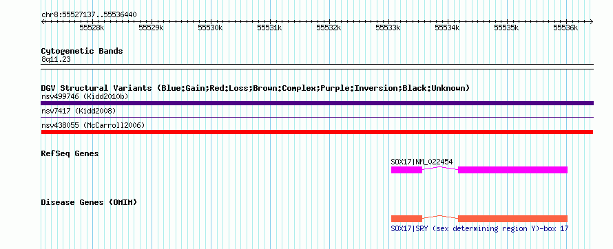 | Variant Type | CNV loss | Copy Number | | Allele State | | Allele Origin | | Probe Count | | Validation Flag | | Merged Status | M | Merged Variants | | Supporting Variants | nssv469979, nssv469980 | Samples | NA19172, NA19128 | Known Genes | SOX17 | Method | SNP array | Analysis | Null genotypes - for each genotype assay and population sample we defined the null genotype pattern of that assay as the binary vector (length 90) of null genotype calls across the 90 individuals. | Platform | Not reported | Comments | | Reference | McCarroll_et_al_2006 | Pubmed ID | 16468122 | Accession Number(s) | nsv438055