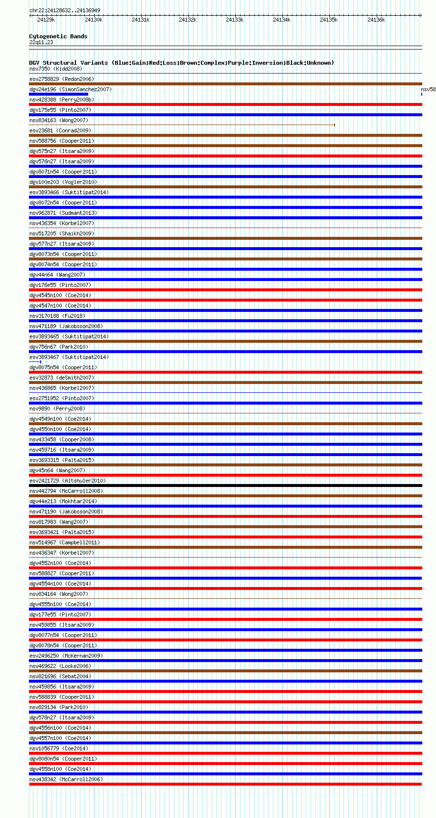 Variant DetailsVariant: nsv438342| Internal ID | 15388152 | | Landmark | | | Location Information | | | Cytoband | 22q11.23 | | Allele length | | Assembly | Allele length | | hg38 | 8318 | | hg19 | 8318 | | hg18 | 8318 | | hg16 | 8318 |