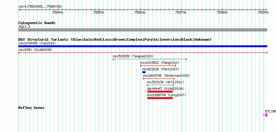 Variant DetailsVariant: nsv4390| Internal ID | 15549095 | | Landmark | | | Location Information | | | Cytoband | 4q13.3 | | Allele length | | Assembly | Allele length | | hg38 | 60325 | | hg19 | 60333 | | hg18 | 60333 | | hg17 | 60333 |