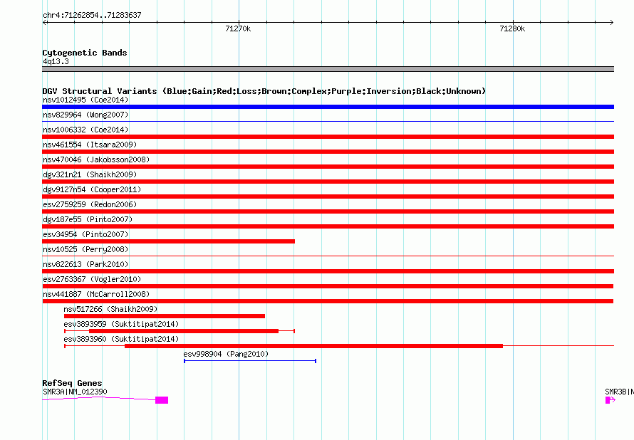 Variant DetailsVariant: nsv441887 | Internal ID | 15500606 | | Landmark | | | Location Information | | | Cytoband | 4q13.3 | | Allele length | | Assembly | Allele length | | hg38 | 20784 | | hg19 | 20784 | | hg18 | 20784 | | hg17 | 20784 |