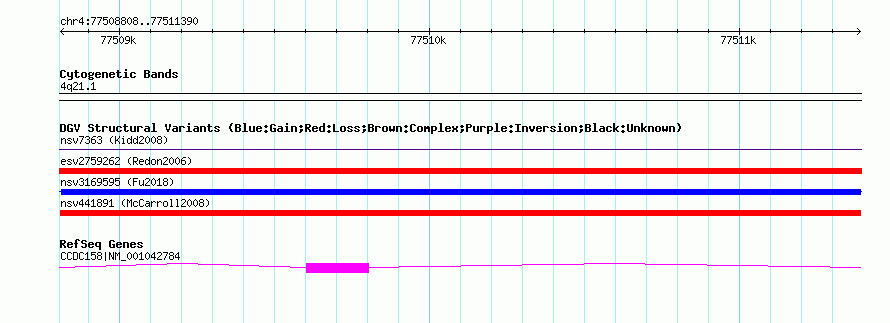 | | Variant Type | CNV loss | | Copy Number | | | Allele State | | | Allele Origin | | | Probe Count | | | Validation Flag | | | Merged Status | M | | Merged Variants | | | Supporting Variants | nssv1657580, nssv1657579, nssv1657578, nssv1657581, nssv1657582 | | Samples | NA12003, NA10838, NA12264, NA07055, NA07034 | | Known Genes | CCDC158 | | Method | SNP array | | Analysis | We used two computational approaches to identify CNVs: the hidden Markov model Birdseye, and an approach based on correlation between nearby probes across a population sample. To maximize the quality of reported findings, we ran duplicate experiments in independent labs, and report the CNVs that were observed in both experiments, in the same samples and at essentially identical genomic locations. | | Platform | [GenomeWideSNP_6] Affymetrix Genome-Wide Human SNP 6.0 Array | | Comments | | | Reference | McCarroll_et_al_2008 | | Pubmed ID | 18776908 | | Accession Number(s) | nsv441891