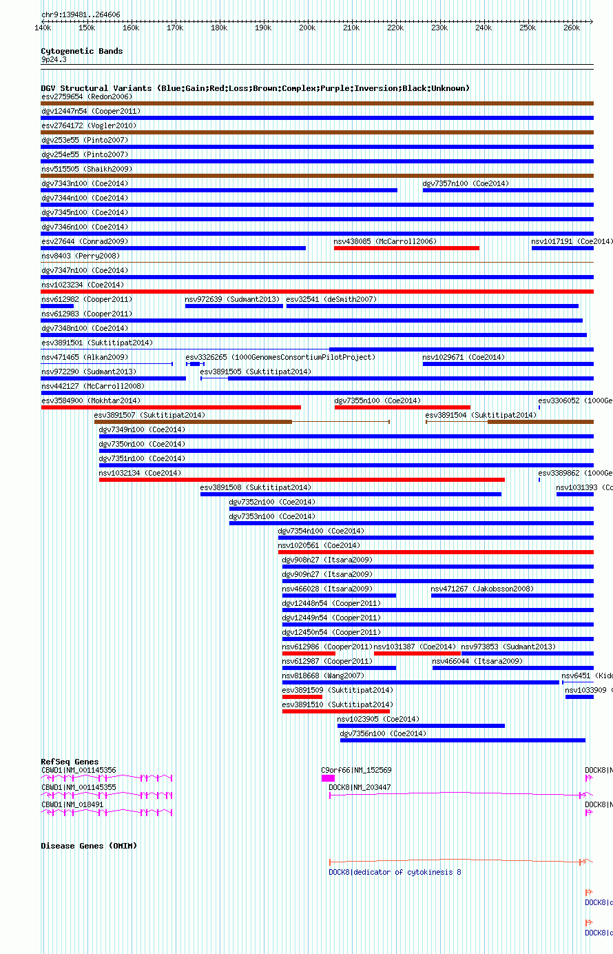 | | Variant Type | CNV gain | | Copy Number | | | Allele State | | | Allele Origin | | | Probe Count | | | Validation Flag | | | Merged Status | M | | Merged Variants | | | Supporting Variants | nssv1658767, nssv1658766 | | Samples | NA18572, NA18576 | | Known Genes | C9orf66, CBWD1, DOCK8 | | Method | SNP array | | Analysis | We used two computational approaches to identify CNVs: the hidden Markov model Birdseye, and an approach based on correlation between nearby probes across a population sample. To maximize the quality of reported findings, we ran duplicate experiments in independent labs, and report the CNVs that were observed in both experiments, in the same samples and at essentially identical genomic locations. | | Platform | [GenomeWideSNP_6] Affymetrix Genome-Wide Human SNP 6.0 Array | | Comments | | | Reference | McCarroll_et_al_2008 | | Pubmed ID | 18776908 | | Accession Number(s) | nsv442127