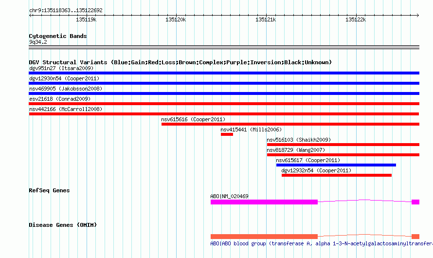 | Variant Type | CNV loss | Copy Number | | Allele State | | Allele Origin | | Probe Count | | Validation Flag | | Merged Status | M | Merged Variants | | Supporting Variants | nssv1658946, nssv1658947, nssv1658948, nssv1658945, nssv1658944 | Samples | NA18855, NA19152, NA19103, NA19154, NA19102 | Known Genes | ABO | Method | SNP array | Analysis | We used two computational approaches to identify CNVs: the hidden Markov model Birdseye, and an approach based on correlation between nearby probes across a population sample. To maximize the quality of reported findings, we ran duplicate experiments in independent labs, and report the CNVs that were observed in both experiments, in the same samples and at essentially identical genomic locations. | Platform | [GenomeWideSNP_6] Affymetrix Genome-Wide Human SNP 6.0 Array | Comments | | Reference | McCarroll_et_al_2008 | Pubmed ID | 18776908 | Accession Number(s) | nsv442166