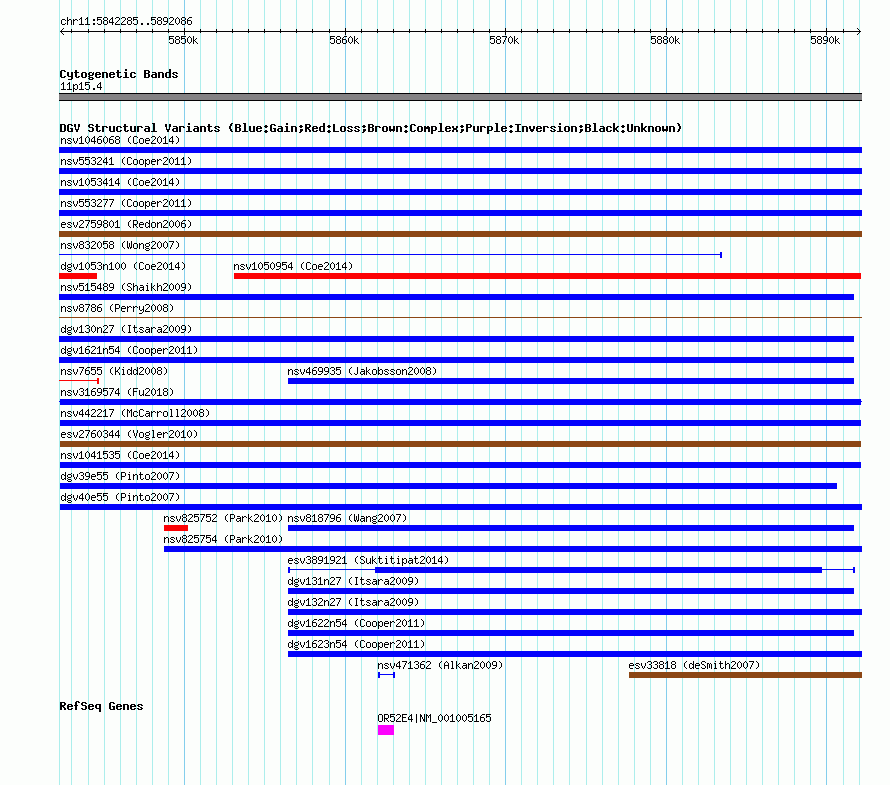 Variant DetailsVariant: nsv442217 | Internal ID | 15500936 | | Landmark | | | Location Information | | | Cytoband | 11p15.4 | | Allele length | | Assembly | Allele length | | hg38 | 49802 | | hg19 | 49802 | | hg18 | 49802 | | hg17 | 49802 |