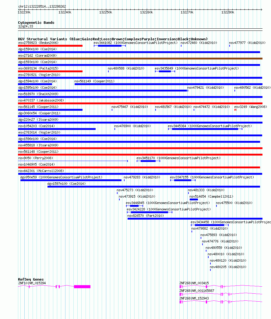 | | Variant Type | CNV gain | | Copy Number | | | Allele State | | | Allele Origin | | | Probe Count | | | Validation Flag | | | Merged Status | M | | Merged Variants | | | Supporting Variants | nssv1659621, nssv1659623, nssv1659624, nssv1659622 | | Samples | NA19238, NA18914, NA18913, NA19240 | | Known Genes | ZNF10, ZNF268 | | Method | SNP array | | Analysis | We used two computational approaches to identify CNVs: the hidden Markov model Birdseye, and an approach based on correlation between nearby probes across a population sample. To maximize the quality of reported findings, we ran duplicate experiments in independent labs, and report the CNVs that were observed in both experiments, in the same samples and at essentially identical genomic locations. | | Platform | [GenomeWideSNP_6] Affymetrix Genome-Wide Human SNP 6.0 Array | | Comments | | | Reference | McCarroll_et_al_2008 | | Pubmed ID | 18776908 | | Accession Number(s) | nsv442301