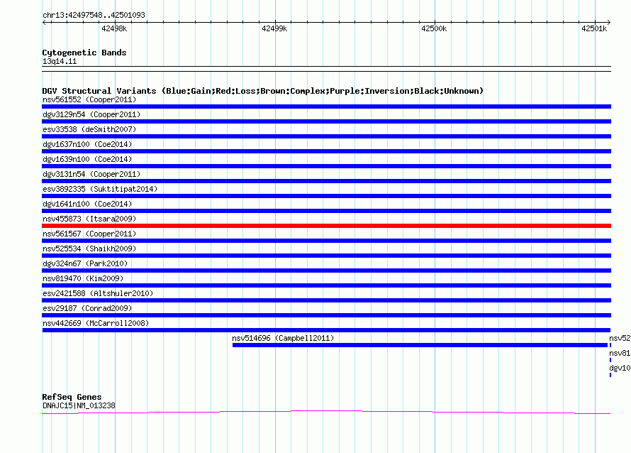 Variant DetailsVariant: nsv442669 | Internal ID | 15154702 | | Landmark | | | Location Information | | | Cytoband | 13q14.11 | | Allele length | | Assembly | Allele length | | hg38 | 3546 | | hg19 | 3546 | | hg18 | 3546 | | hg17 | 3546 |