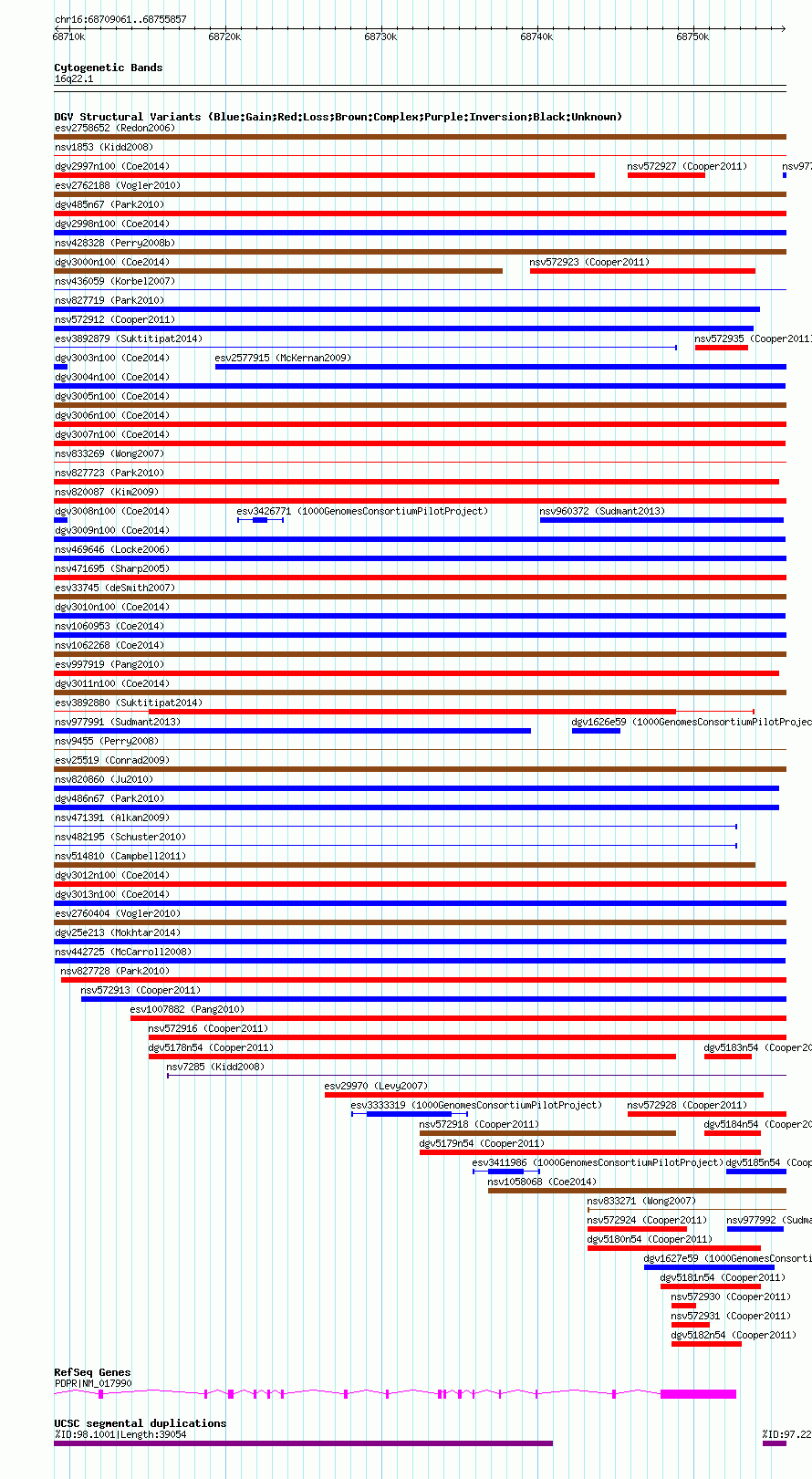 Variant DetailsVariant: nsv442725 Internal ID | 15154758 | Landmark | | Location Information | | Cytoband | 16q22.1 | Allele length | Assembly | Allele length | hg38 | 46797 | hg19 | 46797 | hg18 | 46797 | hg17 | 46797 |