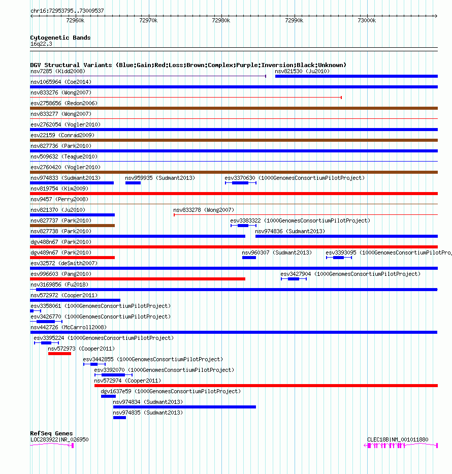 Variant DetailsVariant: nsv442726 | Internal ID | 15501445 | | Landmark | | | Location Information | | | Cytoband | 16q22.3 | | Allele length | | Assembly | Allele length | | hg38 | 55743 | | hg19 | 55743 | | hg18 | 55743 | | hg17 | 55743 |