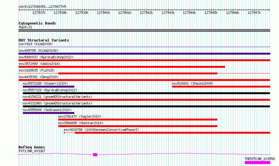 Variant DetailsVariant: nsv4435392| Internal ID | 21397394 | | Landmark | | | Location Information | | | Cytoband | 8q24.21 | | Allele length | | Assembly | Allele length | | hg38 | 11647 | | hg19 | 11647 |