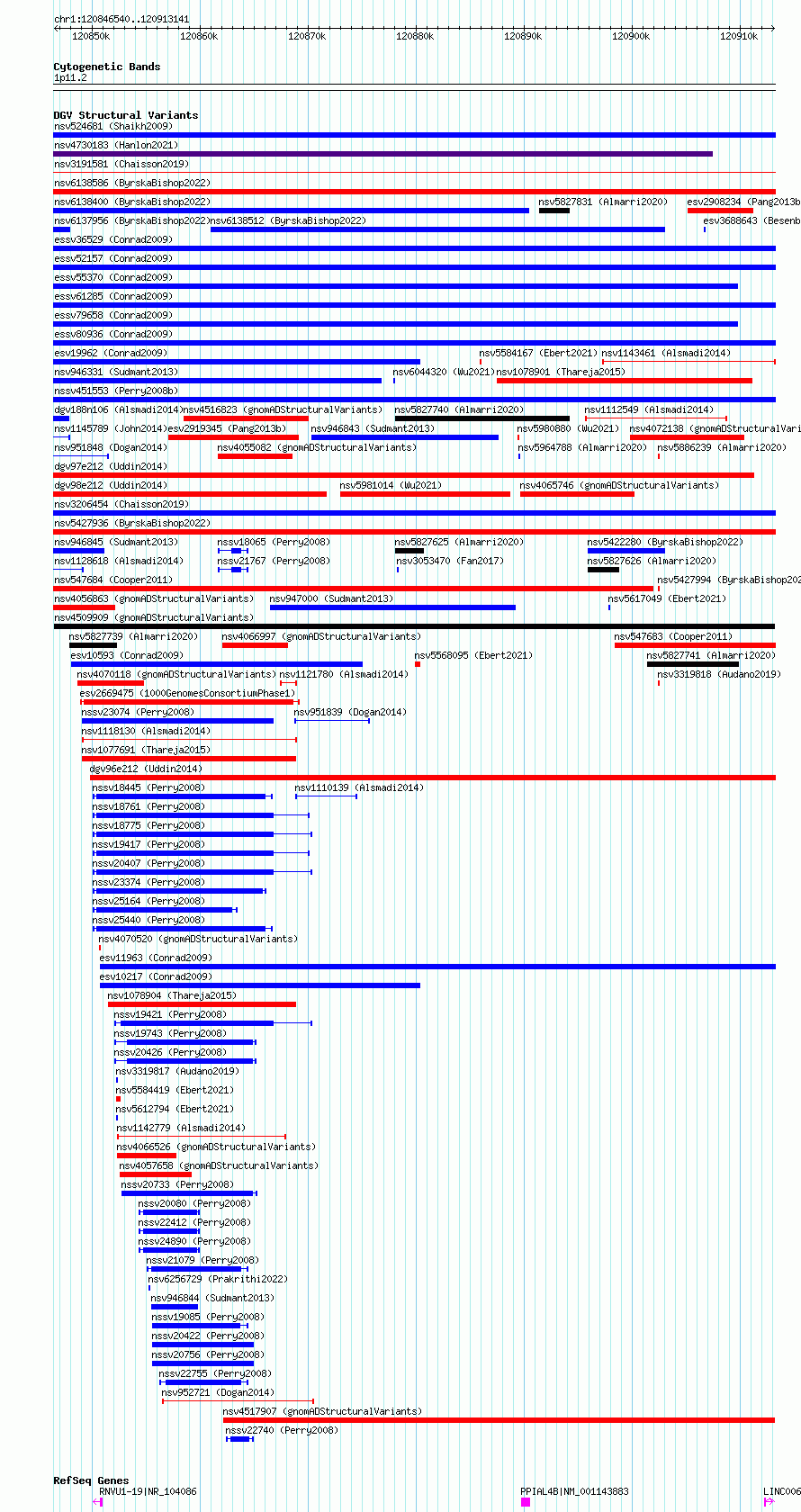 Variant DetailsVariant: nsv4509909 | Internal ID | 20240005 | | Landmark | | | Location Information | | | Cytoband | 1q21.2 | | Allele length | | Assembly | Allele length | | hg38 | 66602 | | hg19 | 67076 |