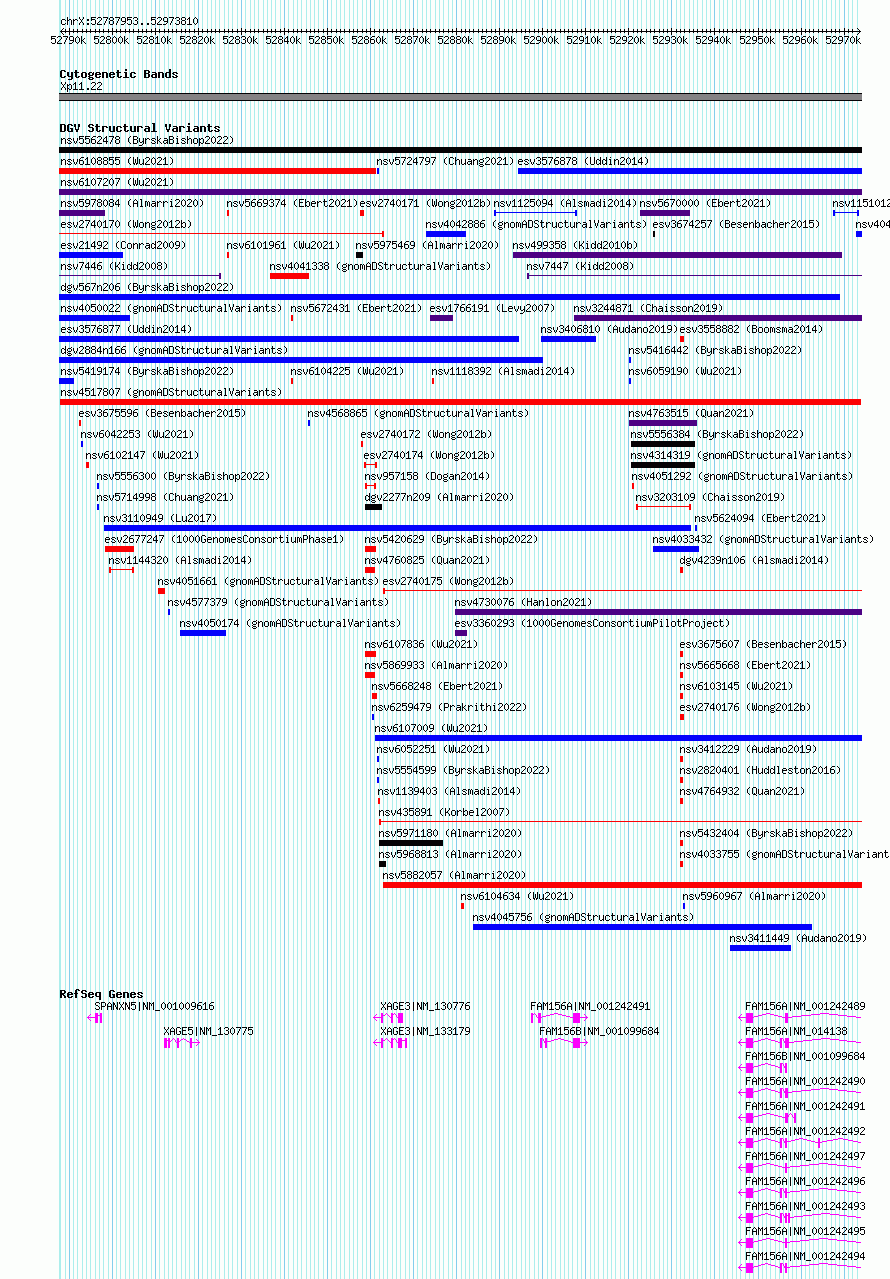 | | Variant Type | CNV deletion | | Copy Number | | | Allele State | | | Allele Origin | | | Probe Count | | | Validation Flag | | | Merged Status | M | | Merged Variants | | | Supporting Variants | nssv15944131 | | Samples | | | Known Genes | FAM156A, FAM156B, SPANXN5, XAGE3, XAGE5 | | Method | Sequencing | | Analysis | SV calls were generated using multi-algorithm consensus pipeline involving raw evidence assessment, filtering, clustering, genotyping, alternative allele structure resolution, and gene annotation. These methods are described in detail in the gnomAD-SV preprint [Collins*, Brand*, et al., bioRxiv (2019)|https://www.biorxiv.org/content/10.1101/578674v1], and are largely based on methods developed in [Werling et al., Nat. Genet. (2018)|https://www.ncbi.nlm.nih.gov/pubmed/29700473]. | | Platform | | | Comments | | | Reference | gnomAD_Structural_Variants | | Pubmed ID | 32461652 | | Accession Number(s) | nsv4517807