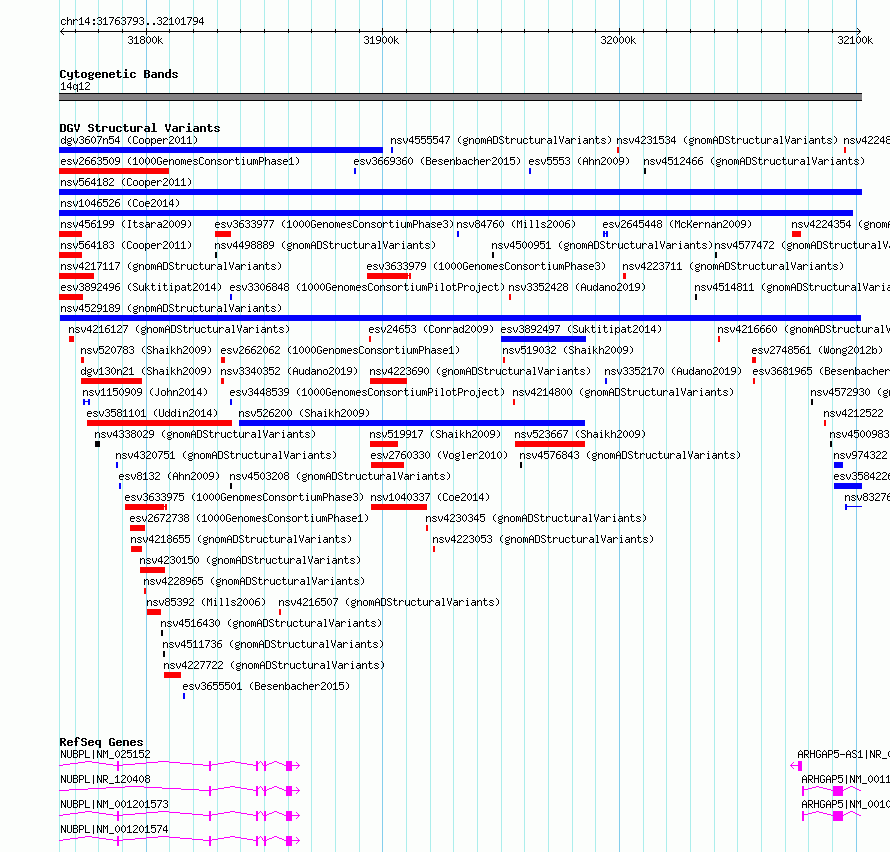 Variant DetailsVariant: nsv4529189 Internal ID | 19912619 | Landmark | | Location Information | | Cytoband | 14q12 | Allele length | Assembly | Allele length | hg38 | 338002 | hg19 | 338002 |