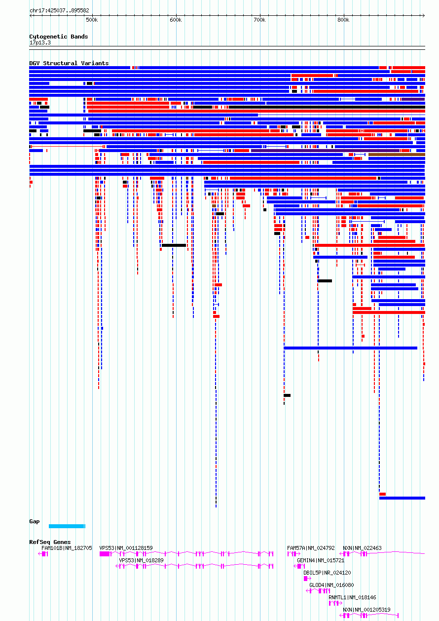 Variant DetailsVariant: nsv4531524 | Internal ID | 20261643 | | Landmark | | | Location Information | | | Cytoband | 17p13.3 | | Allele length | | Assembly | Allele length | | hg38 | 470546 | | hg19 | 523995 |
