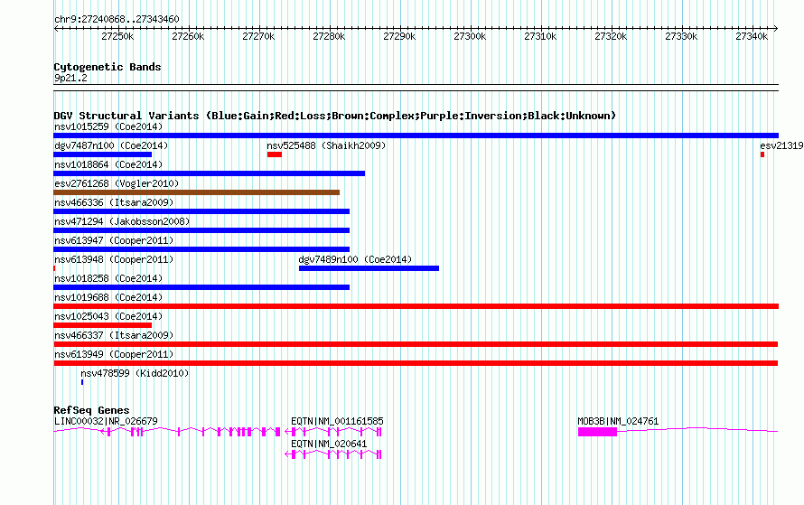 | | Variant Type | CNV loss | | Copy Number | | | Allele State | | | Allele Origin | | | Probe Count | | | Validation Flag | | | Merged Status | M | | Merged Variants | | | Supporting Variants | nssv541909 | | Samples | 1780862529_A | | Known Genes | EQTN, LINC00032, MOB3B | | Method | SNP array | | Analysis | An HMM examining LogR Ratio and B-allele Frequency was used to classify SNP array data into regions of copy-number 0-3. A combination of manual and automated curation was used on the resulting output to reduce false positives. | | Platform | Not reported | | Comments | | | Reference | Itsara_et_al_2009 | | Pubmed ID | 19166990 | | Accession Number(s) | nsv466337