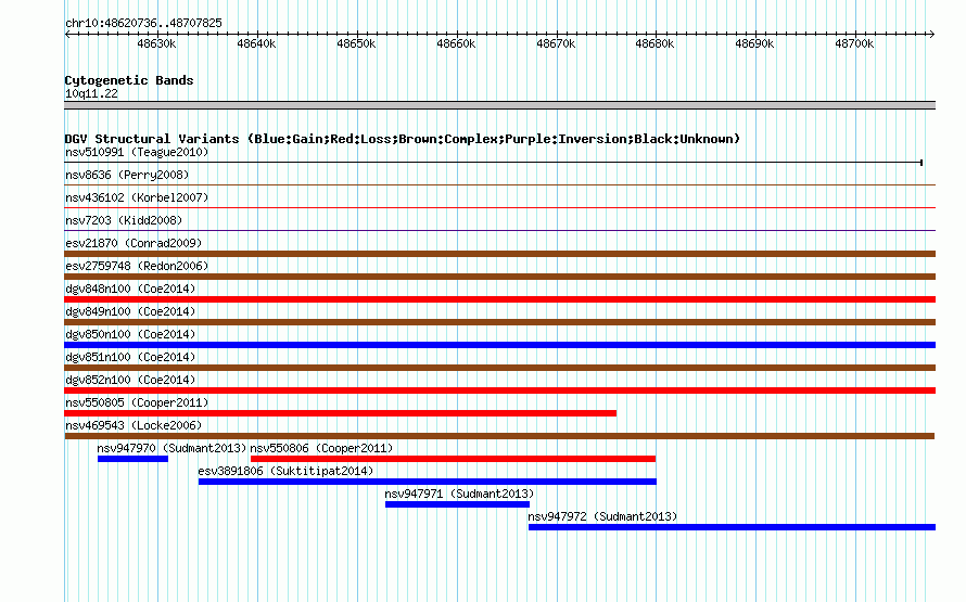 Variant DetailsVariant: nsv469543| Internal ID | 15534258 | | Landmark | | | Location Information | | | Cytoband | 10q11.22 | | Allele length | | Assembly | Allele length | | hg38 | 88335 | | hg19 | 87090 | | hg18 | 87090 | | hg16 | 87090 |