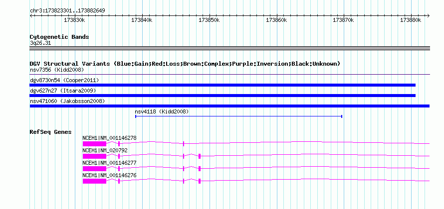 Variant DetailsVariant: nsv471060 | Internal ID | 15557619 | | Landmark | | | Location Information | | | Cytoband | 3q26.31 | | Allele length | | Assembly | Allele length | | hg38 | 59349 | | hg19 | 59349 | | hg18 | 59349 |