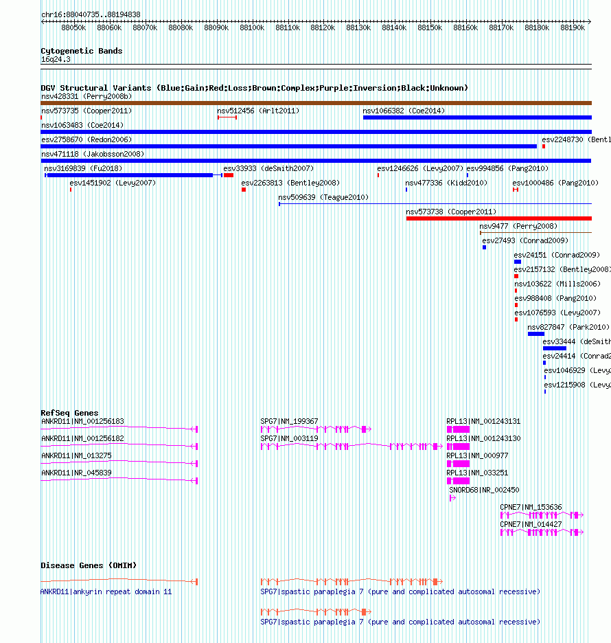 | Known Genes | ANKRD11, CPNE7, RPL13, SNORD68, SPG7 |