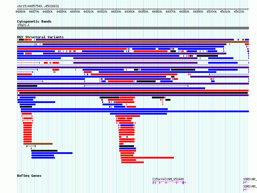| | Variant Type | CNV deletion | | Copy Number | | | Allele State | | | Allele Origin | | | Probe Count | | | Validation Flag | | | Merged Status | M | | Merged Variants | | | Supporting Variants | nssv16290432 | | Samples | | | Known Genes | C15orf43, SORD | | Method | Sequencing | | Analysis | | | Platform | | | Comments | | | Reference | Quan_et_al_2021 | | Pubmed ID | 34034800 | | Accession Number(s) | nsv4748065