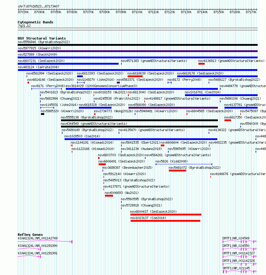 Variant DetailsVariant: nsv483124| Internal ID | 15582237 | | Landmark | | | Location Information | | | Cytoband | 7q21.12 | | Allele length | | Assembly | Allele length | | hg38 | 146885 | | hg19 | 146885 |