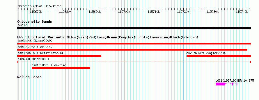 Variant DetailsVariant: nsv4968| Internal ID | 15549730 | | Landmark | | | Location Information | | | Cytoband | 5q23.1 | | Allele length | | Assembly | Allele length | | hg38 | 79086 | | hg19 | 79086 | | hg18 | 79086 | | hg17 | 79086 |