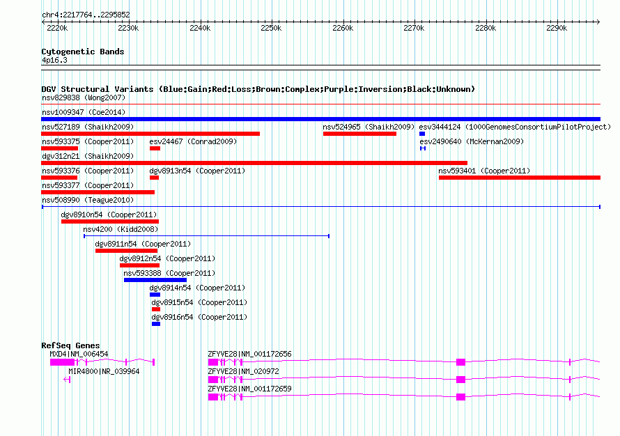 | | Variant Type | CNV insertion | | Copy Number | | | Allele State | | | Allele Origin | | | Probe Count | | | Validation Flag | | | Merged Status | M | | Merged Variants | | | Supporting Variants | nssv619365 | | Samples | NA10860 | | Known Genes | MIR4800, MXD4, ZFYVE28 | | Method | Optical mapping | | Analysis | Single-molecule optical maps were assembled into genome-wide consensus maps. These consensus maps were compared to a restriction map generated from the NCBI b35 human genome reference sequence. | | Platform | Optical Mapping | | Comments | | | Reference | Teague_et_al_2010 | | Pubmed ID | 20534489 | | Accession Number(s) | nsv508990