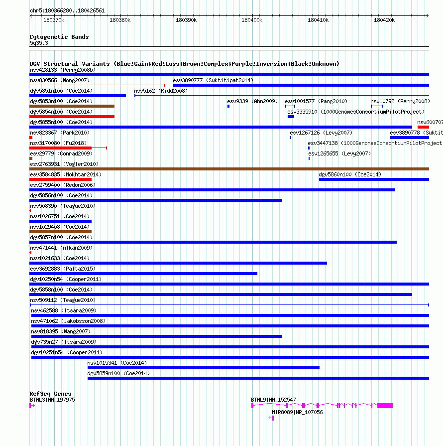 Variant DetailsVariant: nsv509112| Internal ID | 15825138 | | Landmark | | | Location Information | | | Cytoband | 5q35.3 | | Allele length | | Assembly | Allele length | | hg38 | 7972 | | hg19 | 7972 | | hg18 | 7972 | | hg17 | 7972 |