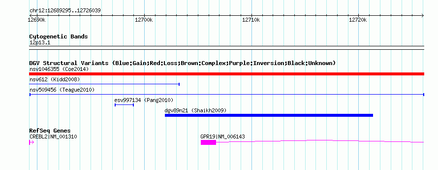 Variant DetailsVariant: nsv509456| Internal ID | 15825482 | | Landmark | | | Location Information | | | Cytoband | 12p13.1 | | Allele length | | Assembly | Allele length | | hg38 | 3080 | | hg19 | 3080 | | hg18 | 3080 | | hg17 | 3080 |