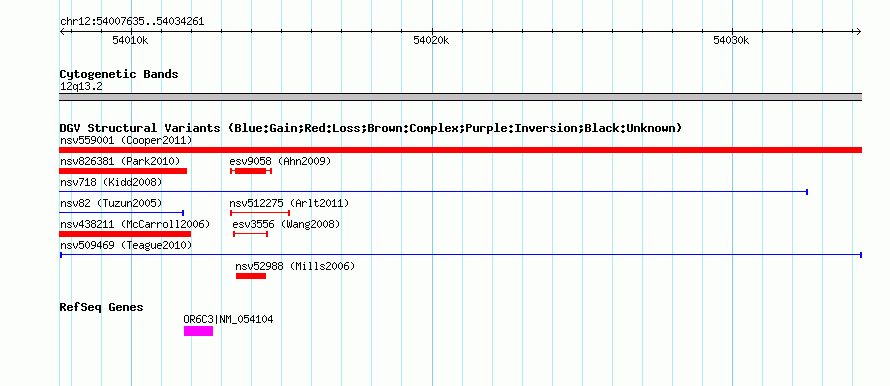 | | Variant Type | CNV insertion | | Copy Number | | | Allele State | | | Allele Origin | | | Probe Count | | | Validation Flag | | | Merged Status | M | | Merged Variants | | | Supporting Variants | nssv620969, nssv619609 | | Samples | NA15510, NA10860 | | Known Genes | OR6C3 | | Method | Optical mapping | | Analysis | Single-molecule optical maps were assembled into genome-wide consensus maps. These consensus maps were compared to a restriction map generated from the NCBI b35 human genome reference sequence. | | Platform | Optical Mapping | | Comments | | | Reference | Teague_et_al_2010 | | Pubmed ID | 20534489 | | Accession Number(s) | nsv509469