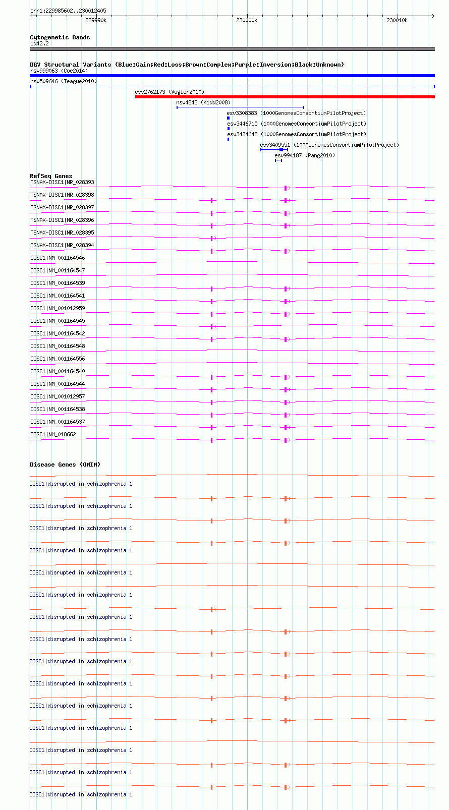 | | Variant Type | CNV insertion | | Copy Number | | | Allele State | | | Allele Origin | | | Probe Count | | | Validation Flag | | | Merged Status | M | | Merged Variants | | | Supporting Variants | nssv623812, nssv619824, nssv617999 | | Samples | CHM, NA18994, NA10860 | | Known Genes | DISC1, TSNAX-DISC1 | | Method | Optical mapping | | Analysis | Single-molecule optical maps were assembled into genome-wide consensus maps. These consensus maps were compared to a restriction map generated from the NCBI b35 human genome reference sequence. | | Platform | Optical Mapping | | Comments | | | Reference | Teague_et_al_2010 | | Pubmed ID | 20534489 | | Accession Number(s) | nsv509646