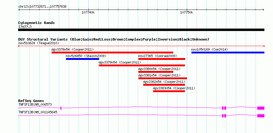 Variant DetailsVariant: nsv510624| Internal ID | 15478120 | | Landmark | | | Location Information | | | Cytoband | 13q33.3 | | Allele length | | Assembly | Allele length | | hg38 | 24968 | | hg19 | 24968 | | hg18 | 24968 | | hg17 | 24968 |