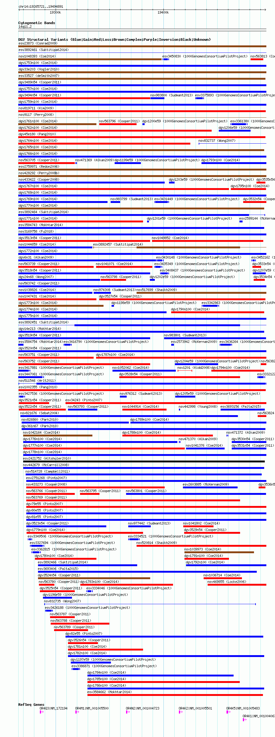 Variant DetailsVariant: nsv511546| Internal ID | 15850971 | | Landmark | | | Location Information | | | Cytoband | 14q11.2 | | Allele length | | Assembly | Allele length | | hg38 | 229171 | | hg19 | 229171 | | hg18 | 229171 |