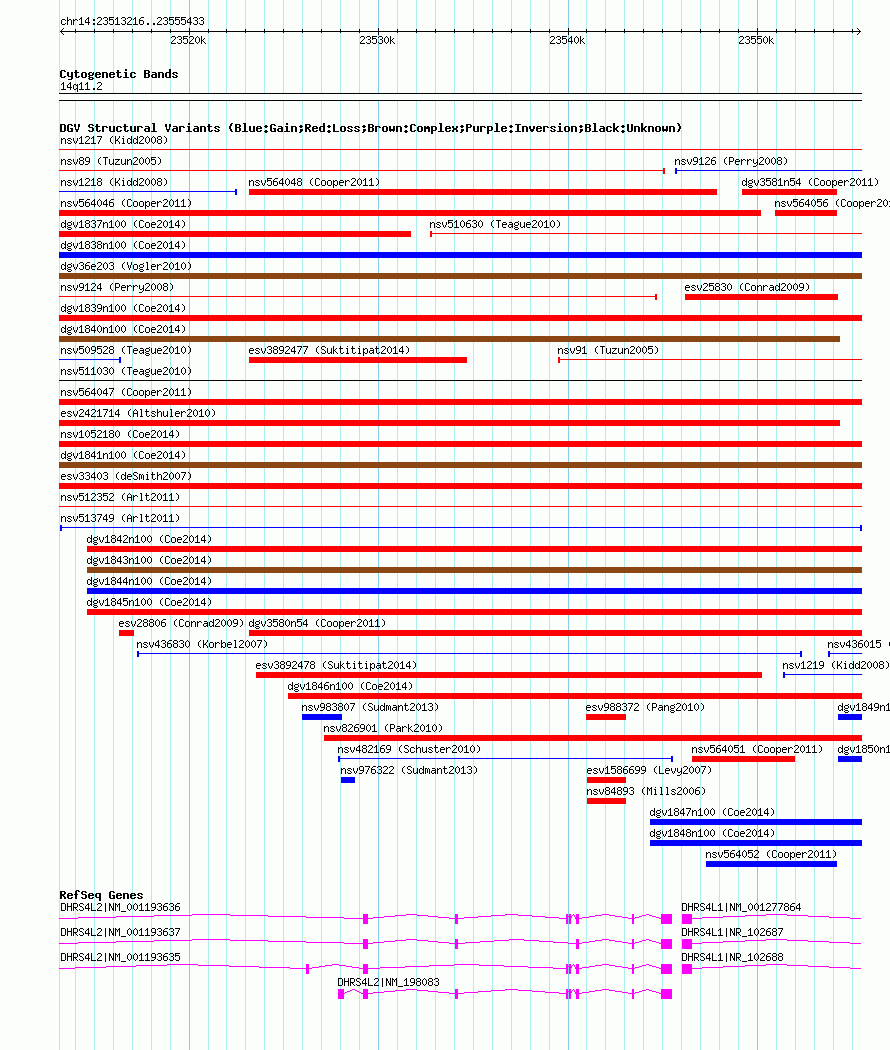Variant DetailsVariant: nsv513749| Internal ID | 15853170 | | Landmark | | | Location Information | | | Cytoband | 14q11.2 | | Allele length | | Assembly | Allele length | | hg38 | 42218 | | hg19 | 42218 | | hg18 | 42218 |