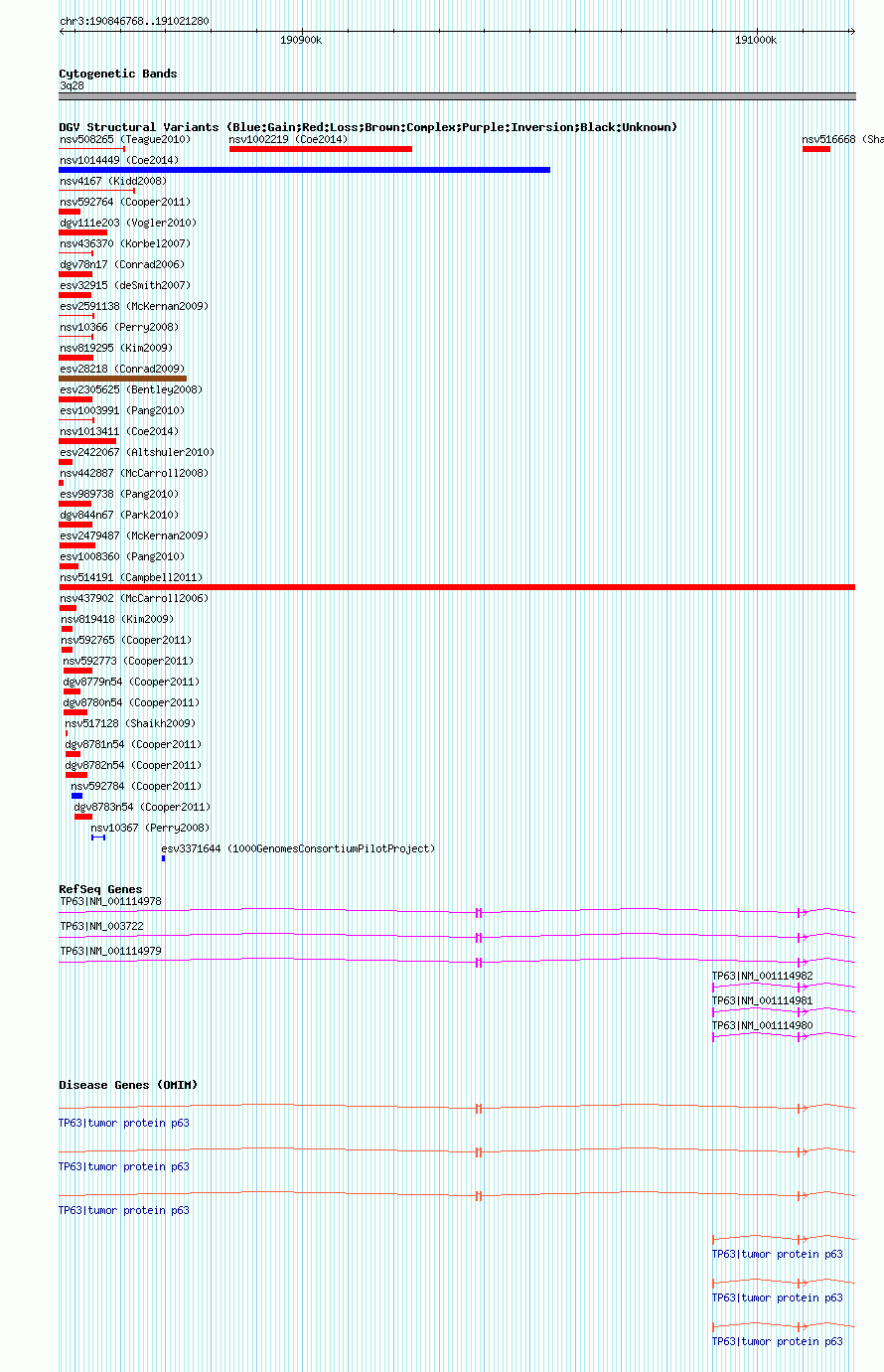 | | Variant Type | CNV loss | | Copy Number | | | Allele State | | | Allele Origin | | | Probe Count | | | Validation Flag | | | Merged Status | M | | Merged Variants | | | Supporting Variants | nssv2895266, nssv2895225, nssv2895200, nssv2895149, nssv2895211, nssv2895251, nssv2895294, nssv2895217, nssv2895213, nssv2895205, nssv2895192, nssv2895165, nssv2895155, nssv2895290, nssv2895289, nssv2895223, nssv2895179, nssv2895281, nssv2895182, nssv2895170, nssv2895216, nssv2895156, nssv2895161, nssv2895221, nssv2895298, nssv2895279, nssv2895234, nssv2895287, nssv2895208, nssv2895176, nssv2895160, nssv2895236, nssv2895306, nssv2895248, nssv2895246, nssv2895202, nssv2895244, nssv2895171, nssv2895271, nssv2895191, nssv2895166, nssv2895215, nssv2895163, nssv2895226, nssv2895210, nssv2895305, nssv2895280, nssv2895262, nssv2895273, nssv2895190, nssv2895230, nssv2895259, nssv2895186, nssv2895257, nssv2895207, nssv2895158, nssv2895261, nssv2895212, nssv2895242, nssv2895302, nssv2895275, nssv2895253, nssv2895258, nssv2895219, nssv2895285, nssv2895269, nssv2895189, nssv2895222, nssv2895187, nssv2895198, nssv2895308, nssv2895174, nssv2895206, nssv2895307, nssv2895227, nssv2895204, nssv2895303, nssv2895162, nssv2895291, nssv2895247, nssv2895185, nssv2895288, nssv2895153, nssv2895228, nssv2895168, nssv2895295, nssv2895229, nssv2895304, nssv2895274, nssv2895243, nssv2895292, nssv2895178, nssv2895252, nssv2895233, nssv2895263, nssv2895209, nssv2895177, nssv2895218, nssv2895152, nssv2895214, nssv2895256, nssv2895220, nssv2895195, nssv2895188, nssv2895284, nssv2895267, nssv2895239, nssv2895265, nssv2895150, nssv2895293, nssv2895282, nssv2895268, nssv2895283, nssv2895297, nssv2895241, nssv2895159, nssv2895232, nssv2895240, nssv2895164, nssv2895154, nssv2895175, nssv2895183, nssv2895238, nssv2895194, nssv2895254, nssv2895296, nssv2895286, nssv2895260, nssv2895250, nssv2895245, nssv2895224, nssv2895193, nssv2895300, nssv2895172, nssv2895309, nssv2895299, nssv2895270, nssv2895277, nssv2895201, nssv2895169, nssv2895278, nssv2895181, nssv2895237, nssv2895180, nssv2895276, nssv2895157, nssv2895264, nssv2895199, nssv2895272, nssv2895203, nssv2895255, nssv2895151, nssv2895167, nssv2895301, nssv2895235, nssv2895249, nssv2895173, nssv2895197, nssv2895196, nssv2895184, nssv2895231 | | Samples | NA18998, NA19237, NA19141, NA21636, NA12842, NA18947, NA19249, NA10845, NA18592, NA18508, NA19122, NA18935, NA18507, NA18999, NA18917, NA18603, NA12045, NA19092, NA18545, NA18504, NA12340, NA18959, NA12832, NA19190, NA18633, NA21522, NA12399, NA18969, NA18967, NA18563, NA19005, NA18940, NA19201, NA21359, NA18995, NA19191, NA19119, NA18635, NA19198, NA18558, NA18547, NA18942, NA21479, NA19197, NA18571, NA19138, NA18949, NA18611, NA18970, NA12274, NA18868, NA21512, NA21454, NA21716, NA18990, NA19239, NA19209, NA21634, NA18975, NA21400, NA21599, NA21480, NA21313, NA19210, NA12753, NA10836, NA19175, NA19152, NA19161, NA18933, NA19184, NA19236, NA18516, NA12877, NA18637, NA18579, NA18910, NA18503, NA19221, NA18907, NA18537, NA18566, NA18573, NA19114, NA19177, NA19142, NA19118, NA19000, NA12386, NA12829, NA19181, NA19151, NA18856, NA12249, NA19154, NA18857, NA12827, NA12264, NA19099, NA12817, NA10852, NA18555, NA19252, NA19225, NA21583, NA19160, NA18570, NA19012, NA18974, NA18576, NA18608, NA21608, NA18953, NA18978, NA18632, NA19183, NA19115, NA19108, NA18961, NA19149, NA18564, NA12272, NA19174, NA12873, NA18992, NA21615, NA21390, NA12763, NA21513, NA18911, NA18594, NA19117, NA18501, NA19109, NA19248, NA21404, NA19223, NA18987, NA19211, NA18994, NA18500, NA18609, NA18506, NA18873, NA21614, NA21486, NA19096, NA18854, NA21455, NA21312, NA18852, NA18968, NA12890, NA21487, NA18511, NA21514, NA18612, NA18622, NA19153, NA18620, NA18997 | | Known Genes | TP63 | | Method | Oligo aCGH | | Analysis | ADM2 threshold = 5 | | Platform | Agilent Eichler Human CNP 180K v3.0 | | Comments | | | Reference | Campbell_et_al_2011 | | Pubmed ID | 21397061 | | Accession Number(s) | nsv514191