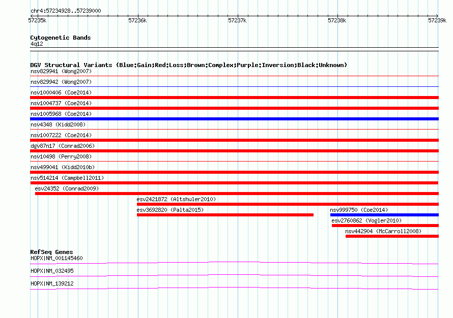 | | Variant Type | CNV loss | | Copy Number | | | Allele State | | | Allele Origin | | | Probe Count | | | Validation Flag | | | Merged Status | M | | Merged Variants | | | Supporting Variants | nssv2908476, nssv2901447, nssv2908493, nssv2908488, nssv2901451, nssv2908482, nssv2908479, nssv2908492, nssv2908486, nssv2908494, nssv2908487, nssv2908474, nssv2908477, nssv2908485, nssv2908489, nssv2908481, nssv2908480, nssv2901449, nssv2908490, nssv2901448, nssv2901452, nssv2908484, nssv2908478, nssv2908491, nssv2901450, nssv2908475, nssv2908483 | | Samples | NA19141, NA19249, NA18855, NA18935, NA19145, NA18486, NA19192, NA18489, NA19198, NA19197, NA19130, NA19199, NA19209, NA19247, NA19194, NA18933, NA19184, NA19236, NA19142, NA19132, NA19240, NA19144, NA19193, NA19182, NA19211, NA19121, NA19224 | | Known Genes | HOPX | | Method | Oligo aCGH | | Analysis | ADM2 threshold = 5 | | Platform | Agilent Eichler Human CNP 180K v3.0 | | Comments | | | Reference | Campbell_et_al_2011 | | Pubmed ID | 21397061 | | Accession Number(s) | nsv514214