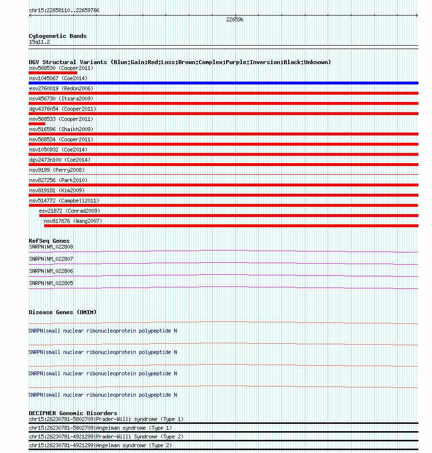 | | Variant Type | CNV loss | | Copy Number | | | Allele State | | | Allele Origin | | | Probe Count | | | Validation Flag | | | Merged Status | M | | Merged Variants | | | Supporting Variants | nssv2808567, nssv2809865, nssv2810014, nssv2815098, nssv2811753, nssv2810519, nssv2813252, nssv2814882, nssv2809075, nssv2814985, nssv2816306, nssv2810140, nssv2818153, nssv2815976, nssv2808504, nssv2815151, nssv2814117, nssv2810484, nssv2810080, nssv2816171, nssv2816652, nssv2814236, nssv2814750, nssv2808586, nssv2814649, nssv2812813, nssv2814237, nssv2808958, nssv2816883, nssv2808825, nssv2816830, nssv2816144, nssv2818442, nssv2809046, nssv2809398, nssv2810625, nssv2818226, nssv2811462, nssv2813266, nssv2811763, nssv2809280, nssv2814032, nssv2816958, nssv2816399, nssv2812500, nssv2818239, nssv2808970, nssv2818386, nssv2811115, nssv2816116, nssv2814650, nssv2814974, nssv2813396, nssv2808505, nssv2810278, nssv2815495, nssv2809679, nssv2818315, nssv2817781, nssv2811618, nssv2814394, nssv2809615, nssv2809600, nssv2815266, nssv2814319, nssv2809550, nssv2816448, nssv2811285 | | Samples | NA18508, NA18980, NA19145, NA18603, NA19092, NA21717, NA21301, NA18870, NA21522, NA18510, NA19127, NA18940, NA18519, NA19201, NA18860, NA19131, NA19197, NA18498, NA21391, NA18874, NA18868, NA19137, NA19128, NA19189, NA19239, NA18908, NA21344, NA18867, NA21494, NA19247, NA19210, NA19194, NA19161, NA18933, NA18956, NA21366, NA19202, NA21441, NA19177, NA18518, NA19181, NA19252, NA18523, NA19160, NA19132, NA21309, NA21302, NA19094, NA19183, NA19149, NA19147, NA18517, NA19144, NA21718, NA19193, NA18869, NA19182, NA19178, NA19211, NA18994, NA21486, NA19116, NA21303, NA18852, NA19129, NA19148, NA21440, NA19214 | | Known Genes | SNRPN | | Method | Oligo aCGH | | Analysis | ADM2 threshold = 5 | | Platform | Agilent Eichler Human CNP 180K v3.0 | | Comments | | | Reference | Campbell_et_al_2011 | | Pubmed ID | 21397061 | | Accession Number(s) | nsv514772