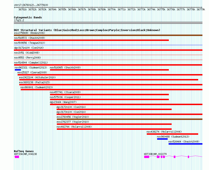| | Variant Type | CNV loss | | Copy Number | | | Allele State | | | Allele Origin | | | Probe Count | | | Validation Flag | | | Merged Status | M | | Merged Variants | | | Supporting Variants | nssv2832403, nssv2832436, nssv2832439, nssv2832405, nssv2832433, nssv2832399, nssv2832425, nssv2832391, nssv2832424, nssv2832432, nssv2832434, nssv2832428, nssv2832393, nssv2832435, nssv2832426, nssv2832430, nssv2832410, nssv2832414, nssv2832398, nssv2832443, nssv2832441, nssv2832402, nssv2832392, nssv2832429, nssv2832427, nssv2832406, nssv2832419, nssv2832395, nssv2832422, nssv2832418, nssv2832413, nssv2832415, nssv2832423, nssv2832421, nssv2832416, nssv2832394, nssv2832397, nssv2832407, nssv2832408, nssv2832396, nssv2832442, nssv2832420, nssv2832431, nssv2832412, nssv2832409, nssv2832400, nssv2832440, nssv2832411, nssv2832404, nssv2832437, nssv2832417, nssv2832401, nssv2832438 | | Samples | NA19237, NA19222, NA21636, NA19204, NA18508, NA18935, NA18917, NA21648, NA19190, NA19098, NA21359, NA18489, NA19191, NA18860, NA19131, NA18916, NA19235, NA19239, NA19209, NA21634, NA18908, NA21344, NA19200, NA19152, NA18933, NA18859, NA19184, NA19205, NA18485, NA19103, NA19202, NA19114, NA19142, NA18930, NA19113, NA19154, NA19101, NA19257, NA19095, NA19094, NA19115, NA19108, NA19140, NA19240, NA19100, NA21361, NA19182, NA19211, NA19093, NA18500, NA18506, NA21312, NA18522 | | Known Genes | KRT33A, KRT33B | | Method | Oligo aCGH | | Analysis | ADM2 threshold = 5 | | Platform | Agilent Eichler Human CNP 180K v3.0 | | Comments | | | Reference | Campbell_et_al_2011 | | Pubmed ID | 21397061 | | Accession Number(s) | nsv514844