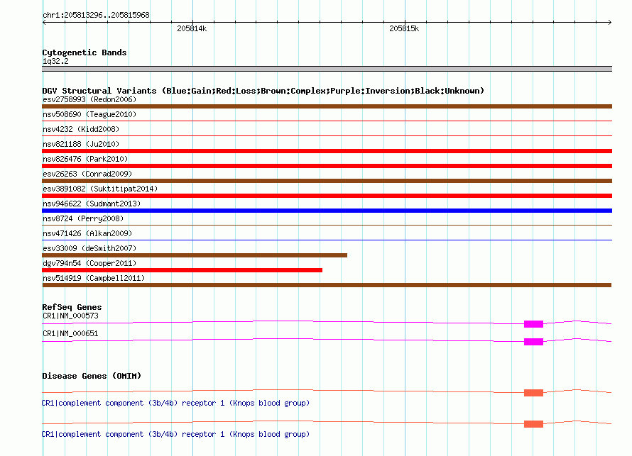 | | Variant Type | CNV gain+loss | | Copy Number | | | Allele State | | | Allele Origin | | | Probe Count | | | Validation Flag | | | Merged Status | M | | Merged Variants | | | Supporting Variants | nssv2854903, nssv2854900, nssv2854896, nssv2854899, nssv2854906, nssv2854901, nssv2854904, nssv2854898, nssv2854897, nssv2854908, nssv2854909, nssv2854902, nssv2854907, nssv2854905 | | Samples | NA19141, NA12286, NA19107, NA19131, NA19123, NA11994, NA19239, NA21442, NA21366, NA12239, NA19225, NA19193, NA18594, NA19121 | | Known Genes | CR1 | | Method | Oligo aCGH | | Analysis | ADM2 threshold = 5 | | Platform | Agilent Eichler Human CNP 180K v3.0 | | Comments | | | Reference | Campbell_et_al_2011 | | Pubmed ID | 21397061 | | Accession Number(s) | nsv514919