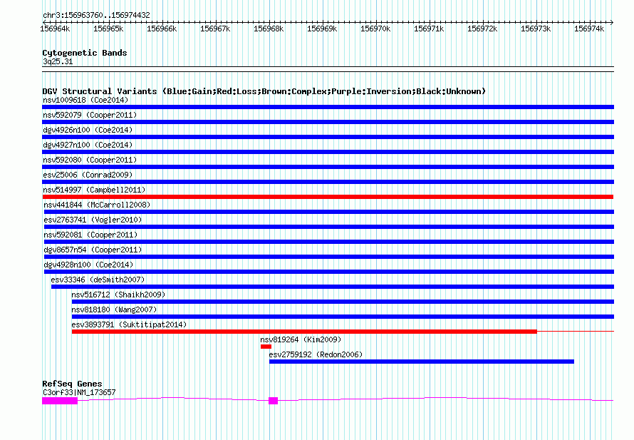 Variant DetailsVariant: nsv514997 | Internal ID | 15466631 | | Landmark | | | Location Information | | | Cytoband | 3q25.31 | | Allele length | | Assembly | Allele length | | hg38 | 10673 | | hg19 | 10673 | | hg18 | 10673 |