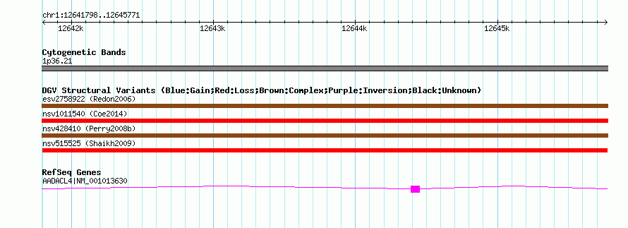 |  | Variant Type | CNV loss |  | Copy Number |  |  | Allele State |  |  | Allele Origin |  |  | Probe Count |  |  | Validation Flag |  |  | Merged Status | M |  | Merged Variants |  |  | Supporting Variants | nssv663825, nssv687835, nssv691346, nssv655876 |  | Samples |  |  | Known Genes | AADACL4 |  | Method | SNP array |  | Analysis | Sample-level CNVs |  | Platform | GPL6434 |  | Comments |  |  | Reference | Shaikh_et_al_2009 |  | Pubmed ID | 19592680 |  | Accession Number(s) | nsv515525