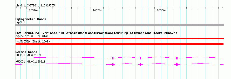 Variant DetailsVariant: nsv515589| Internal ID | 15443200 | | Landmark | | | Location Information | | | Cytoband | 8q23.1 | | Allele length | | Assembly | Allele length | | hg38 | 32476 | | hg19 | 32476 | | hg18 | 32476 | | hg17 | 32476 |