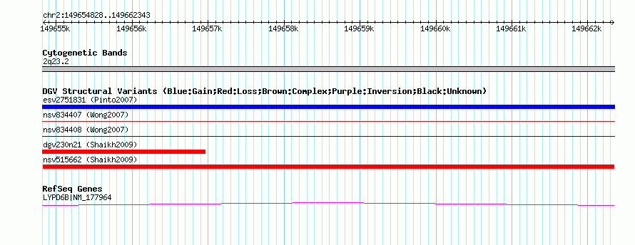 | | Variant Type | CNV loss | | Copy Number | | | Allele State | | | Allele Origin | | | Probe Count | | | Validation Flag | | | Merged Status | M | | Merged Variants | | | Supporting Variants | nssv664285, nssv670370, nssv674026, nssv659799 | | Samples | | | Known Genes | LYPD6B | | Method | SNP array | | Analysis | Sample-level CNVs | | Platform | GPL6434 | | Comments | | | Reference | Shaikh_et_al_2009 | | Pubmed ID | 19592680 | | Accession Number(s) | nsv515662