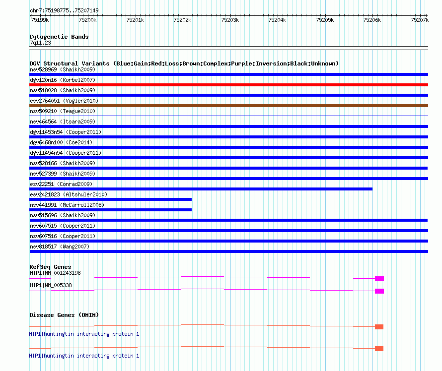 | | Variant Type | CNV gain | | Copy Number | | | Allele State | | | Allele Origin | | | Probe Count | | | Validation Flag | | | Merged Status | M | | Merged Variants | | | Supporting Variants | nssv699828, nssv651998, nssv704636, nssv686150, nssv660530, nssv659459 | | Samples | | | Known Genes | HIP1 | | Method | SNP array | | Analysis | Sample-level CNVs | | Platform | GPL6434 | | Comments | | | Reference | Shaikh_et_al_2009 | | Pubmed ID | 19592680 | | Accession Number(s) | nsv515696