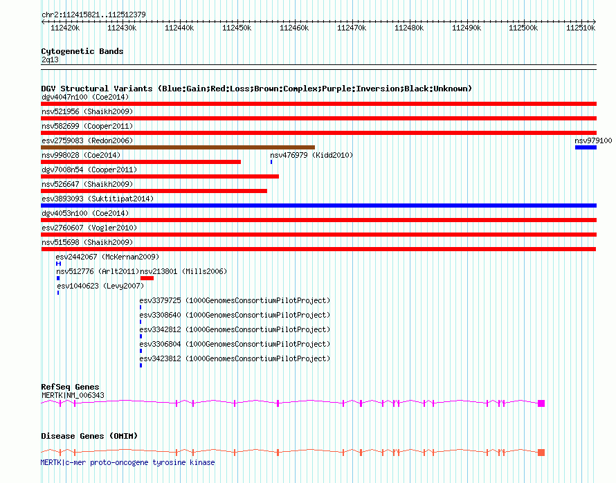 | | Variant Type | CNV loss | | Copy Number | | | Allele State | | | Allele Origin | | | Probe Count | | | Validation Flag | | | Merged Status | M | | Merged Variants | | | Supporting Variants | nssv693497, nssv664457, nssv690449 | | Samples | | | Known Genes | MERTK | | Method | SNP array | | Analysis | Sample-level CNVs | | Platform | GPL6434 | | Comments | | | Reference | Shaikh_et_al_2009 | | Pubmed ID | 19592680 | | Accession Number(s) | nsv515698