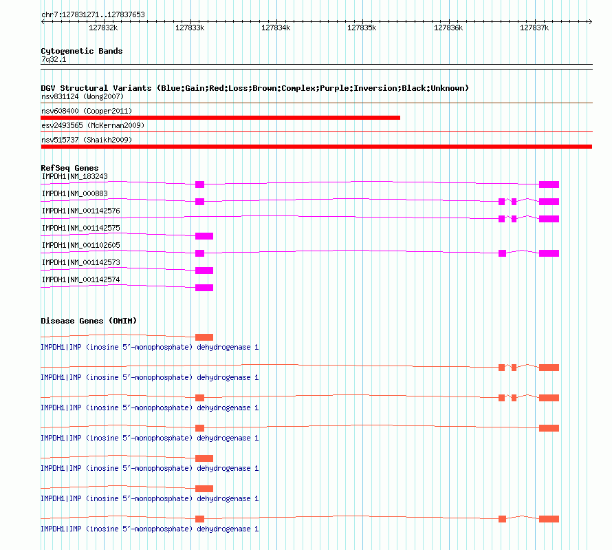| | Variant Type | CNV loss | | Copy Number | | | Allele State | | | Allele Origin | | | Probe Count | | | Validation Flag | | | Merged Status | M | | Merged Variants | | | Supporting Variants | nssv682442, nssv677251, nssv664637, nssv670214, nssv682787 | | Samples | | | Known Genes | IMPDH1 | | Method | SNP array | | Analysis | Sample-level CNVs | | Platform | GPL6434 | | Comments | | | Reference | Shaikh_et_al_2009 | | Pubmed ID | 19592680 | | Accession Number(s) | nsv515737