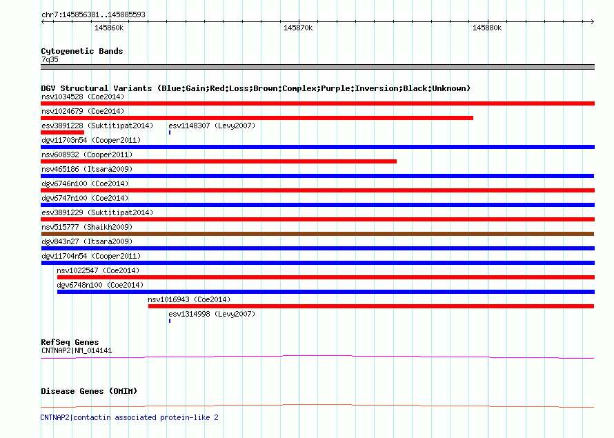 | | Variant Type | CNV gain+loss | | Copy Number | | | Allele State | | | Allele Origin | | | Probe Count | | | Validation Flag | | | Merged Status | M | | Merged Variants | | | Supporting Variants | nssv691783, nssv690718, nssv678740, nssv664746, nssv693117, nssv669873, nssv680401, nssv690052, nssv683717, nssv675650, nssv659316, nssv681860, nssv678409, nssv660855, nssv668863 | | Samples | | | Known Genes | CNTNAP2 | | Method | SNP array | | Analysis | Sample-level CNVs | | Platform | GPL6434 | | Comments | | | Reference | Shaikh_et_al_2009 | | Pubmed ID | 19592680 | | Accession Number(s) | nsv515777