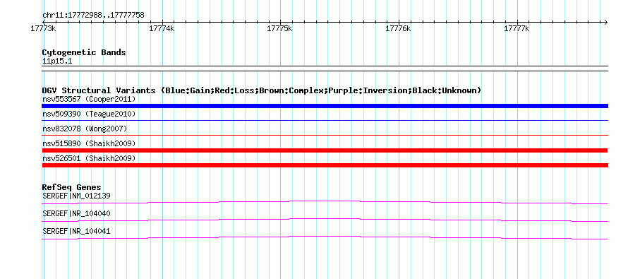 Variant DetailsVariant: nsv515890| Internal ID | 15442947 | | Landmark | | | Location Information | | | Cytoband | 11p15.1 | | Allele length | | Assembly | Allele length | | hg38 | 4771 | | hg19 | 4771 | | hg18 | 4771 | | hg17 | 4771 |