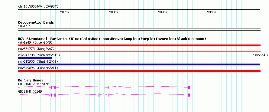 Variant DetailsVariant: nsv515935| Internal ID | 15442992 | | Landmark | | | Location Information | | | Cytoband | 10p15.1 | | Allele length | | Assembly | Allele length | | hg38 | 49446 | | hg19 | 49446 | | hg18 | 49446 | | hg17 | 49446 |