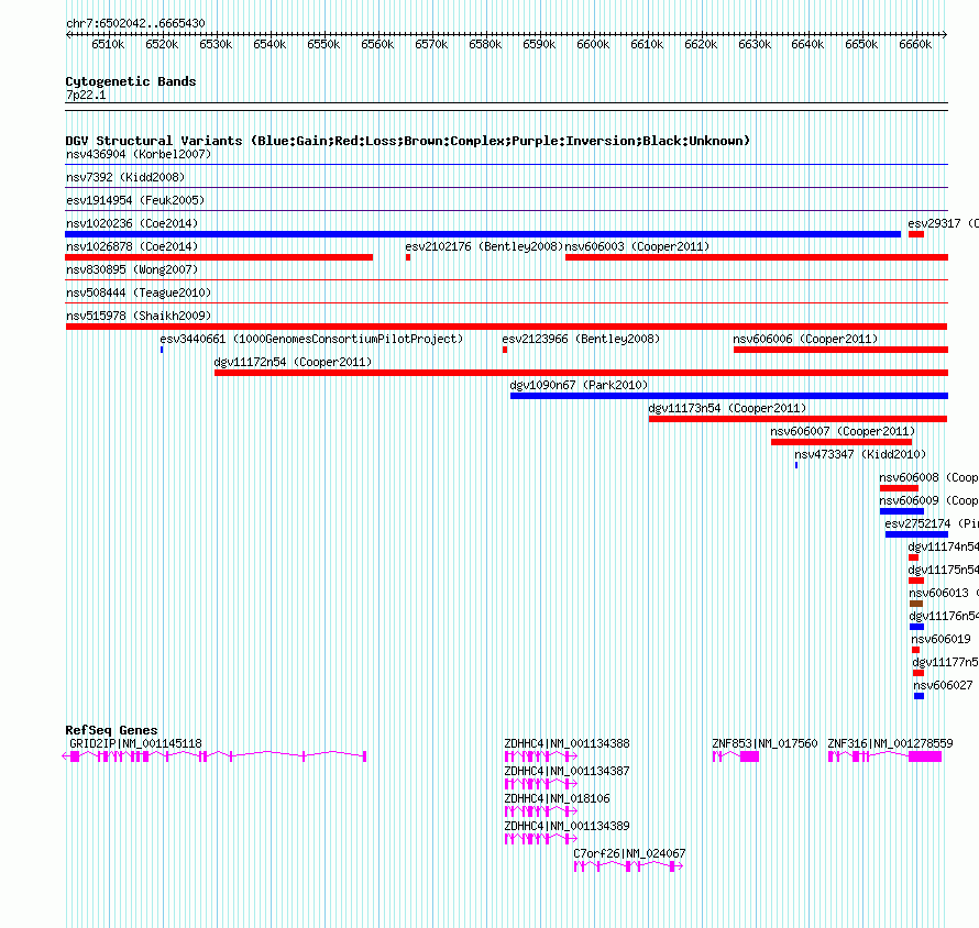 | | Variant Type | CNV loss | | Copy Number | | | Allele State | | | Allele Origin | | | Probe Count | | | Validation Flag | | | Merged Status | M | | Merged Variants | | | Supporting Variants | nssv697665, nssv705793, nssv699517, nssv665570, nssv697664, nssv659442 | | Samples | | | Known Genes | C7orf26, GRID2IP, ZDHHC4, ZNF316, ZNF853 | | Method | SNP array | | Analysis | Sample-level CNVs | | Platform | GPL6434 | | Comments | | | Reference | Shaikh_et_al_2009 | | Pubmed ID | 19592680 | | Accession Number(s) | nsv515978
